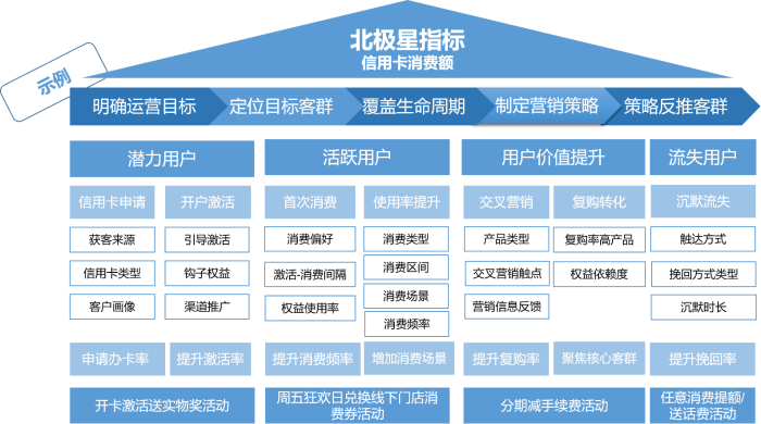 以信用卡活动为例(图2),如果设定信用卡消费额提升作为北极星指标,可先根据目标客群所处生命周期做阶段划分,如潜力用户、活跃用户、成熟期用户、流失用户。对处于不同阶段的客群,运营工作的重点也是有所差异的。比如,潜力客群的运营更关注申请及激活率,而对流失风险较高的客群则更关注沉默时长、挽回率等指标。待目标拆解到位之后,再围绕细化指标有针对性地开展活动策划。