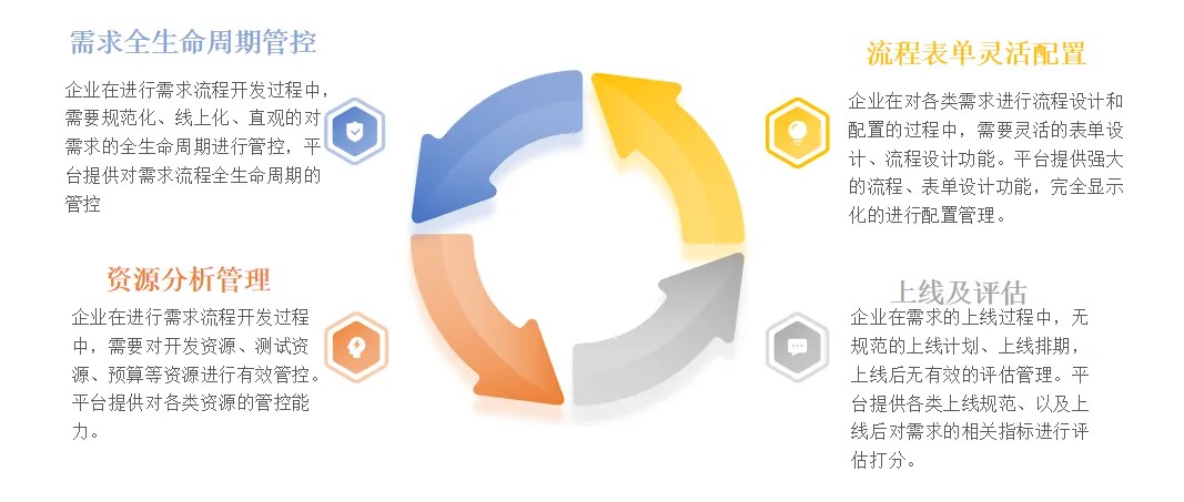 ● 需求全生命周期管控:通过需求管理平台,对各类需求从提出、分析、评估、实施、上线等环节进行精细化管控。保证了需求实施交付的规范化。